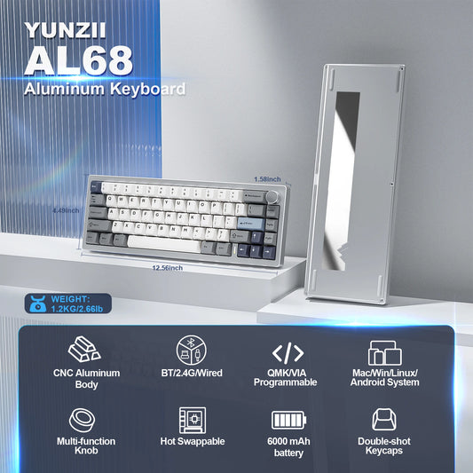 YUNZII AL68 Silver Wireless Custom Mechanical Keyboard, QMK/VIA Aluminum Keyboard, Hot Swap Gasket Gaming Keyboard with Knob