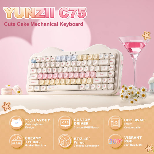 YUNZII C75 Wireless Mechanical Keyboard, 75% Creamy Hot Swap Custom RGB Keyboard, Gasket Cute Cake Design, for Win/Mac/Gaming