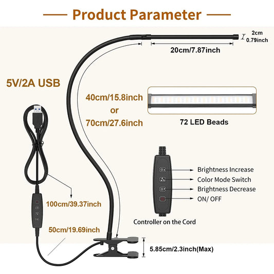 10W LED Desk Lamp with Clamp Dimmable Clip On Reading Light 10 Brightness Level 3 Lighting Modes Flexible Study Table Lamp USB