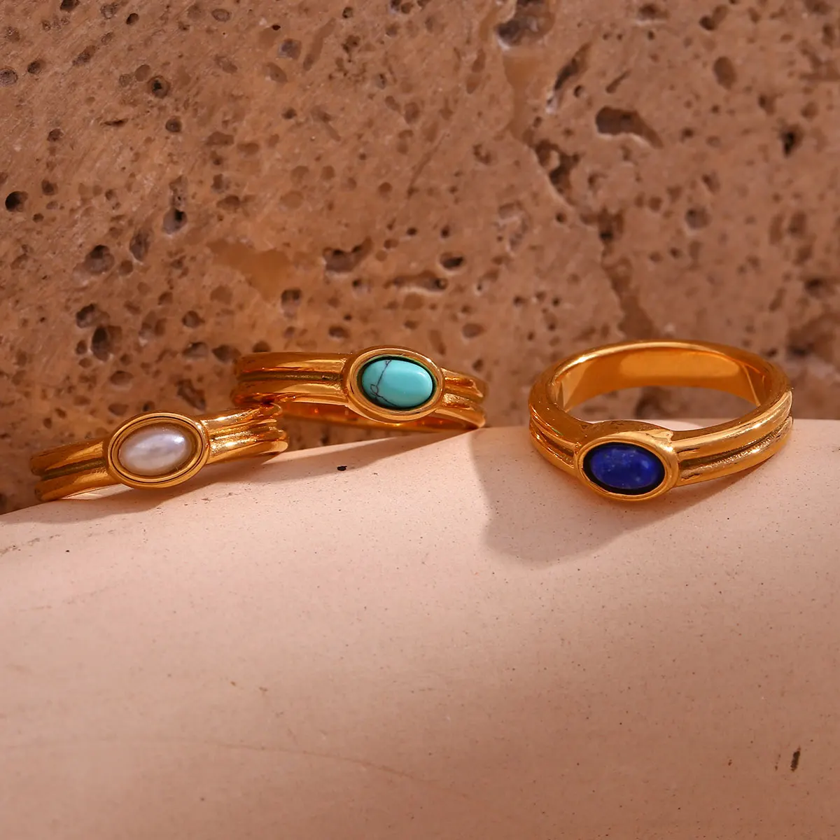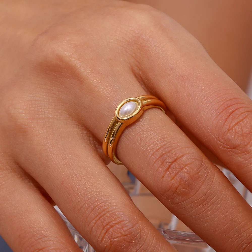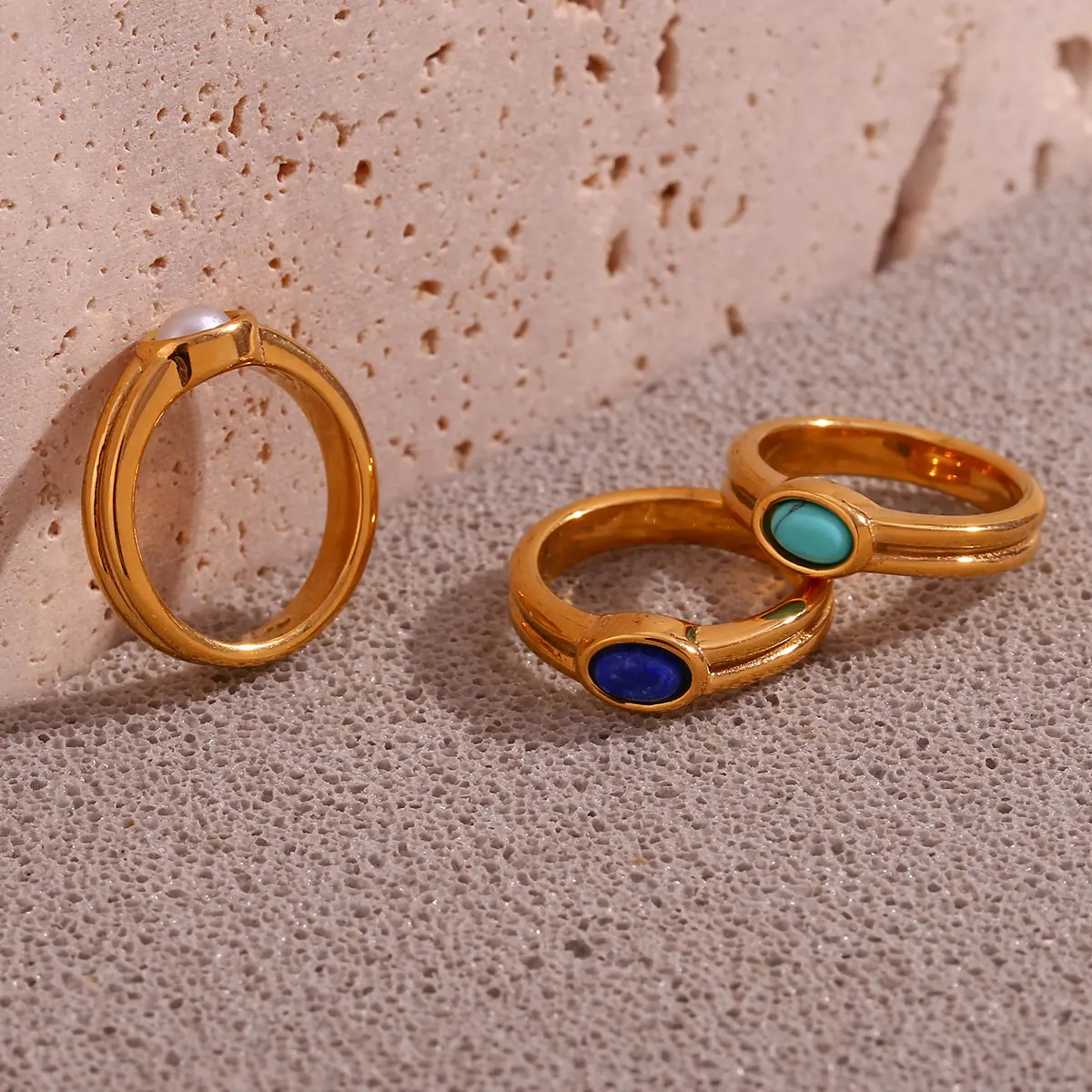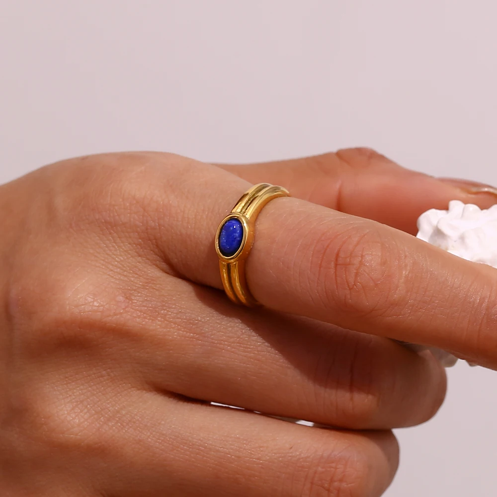 E.B.belle Females Y2K Accessories Natural Stone Lapis Turquoise Pearl Paved Stainless Steel Non Tarnished Rings For Woman