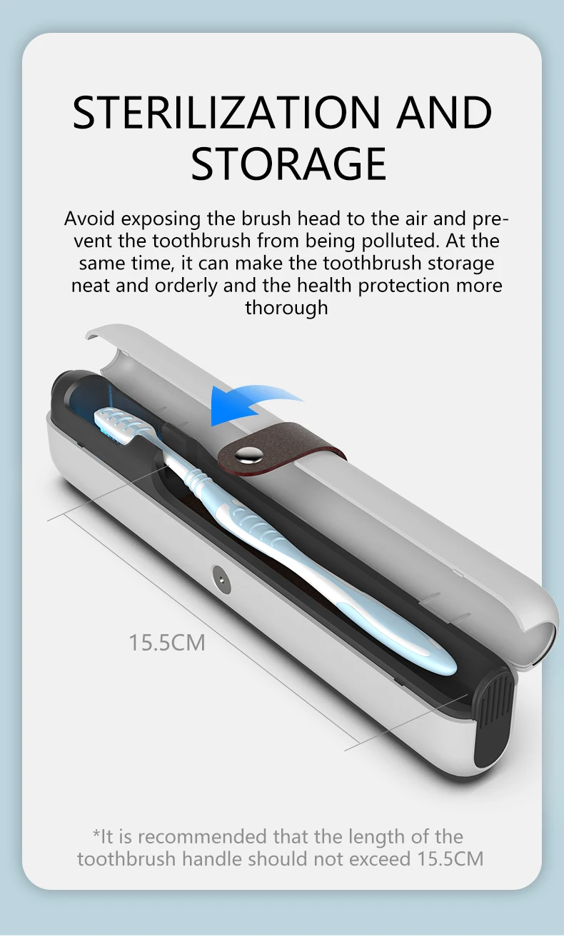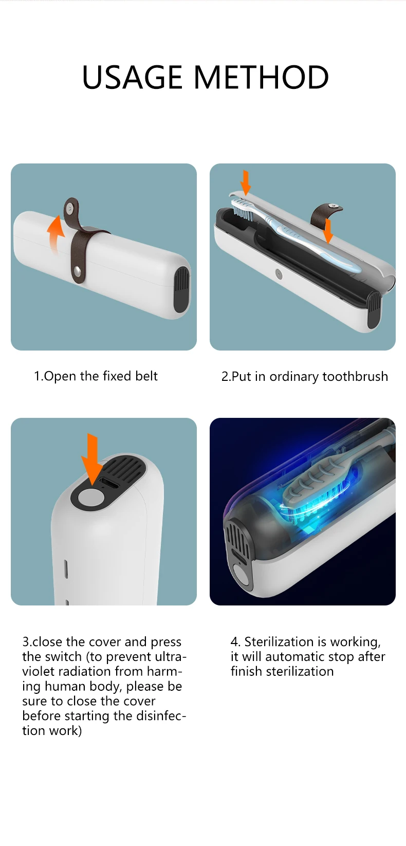 3.Easy to Use: Put your toothbrush into the toothbrush case and close the lid, it will work automatically, after 3 minutes the toothbrush cleaner will turn off automatically.