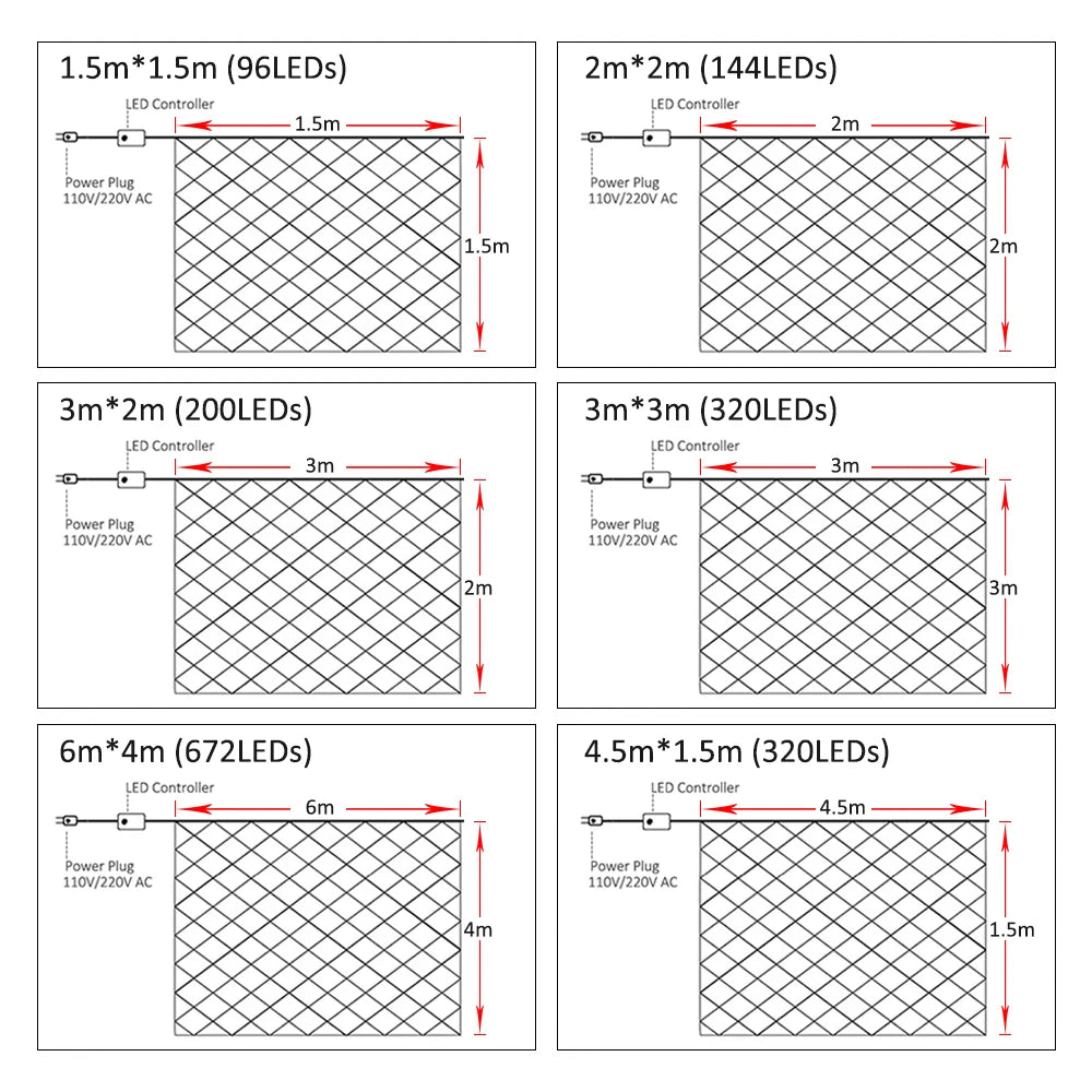 Bright and durable LED Net String Lights designed for outdoor and indoor decoration. With multiple size options, 8 lighting modes, and IP65 waterproof protection, they’re perfect for Christmas décor, weddings, gardens, balconies, and commercial spaces. Just plug in and enjoy instant festive illumination.