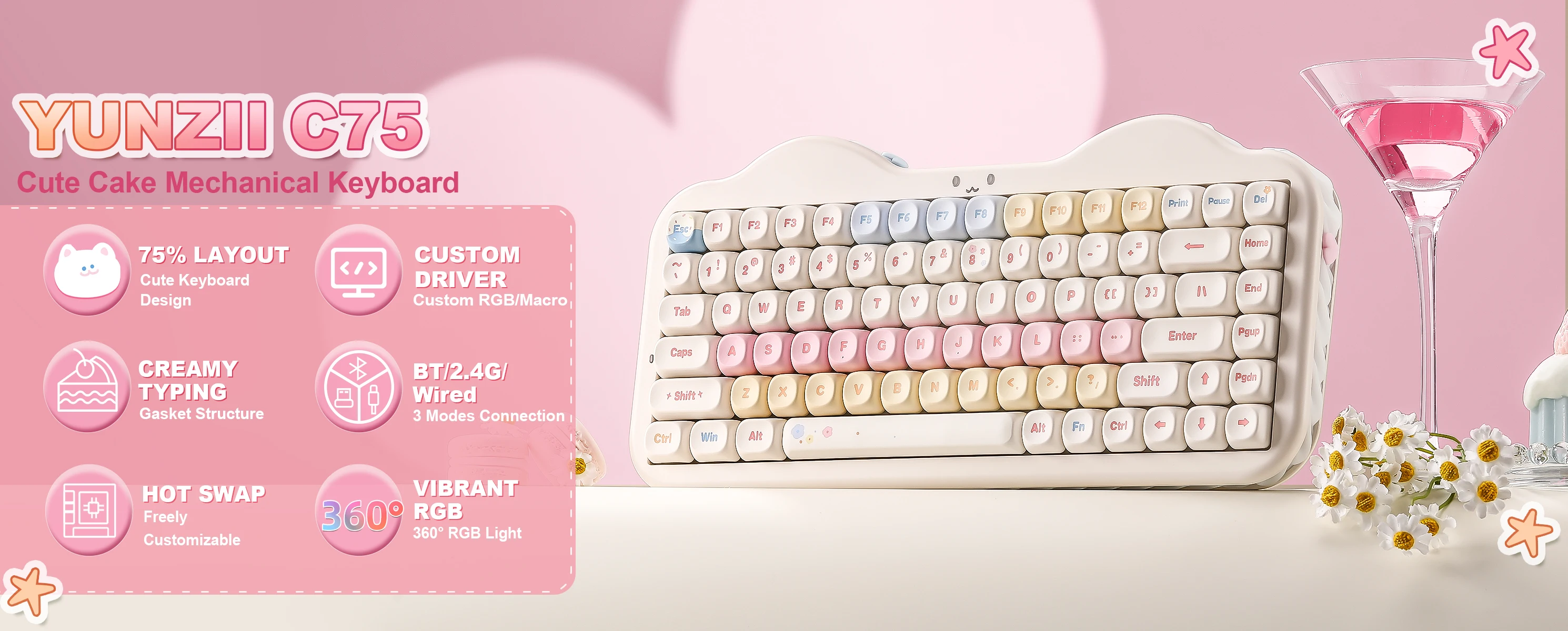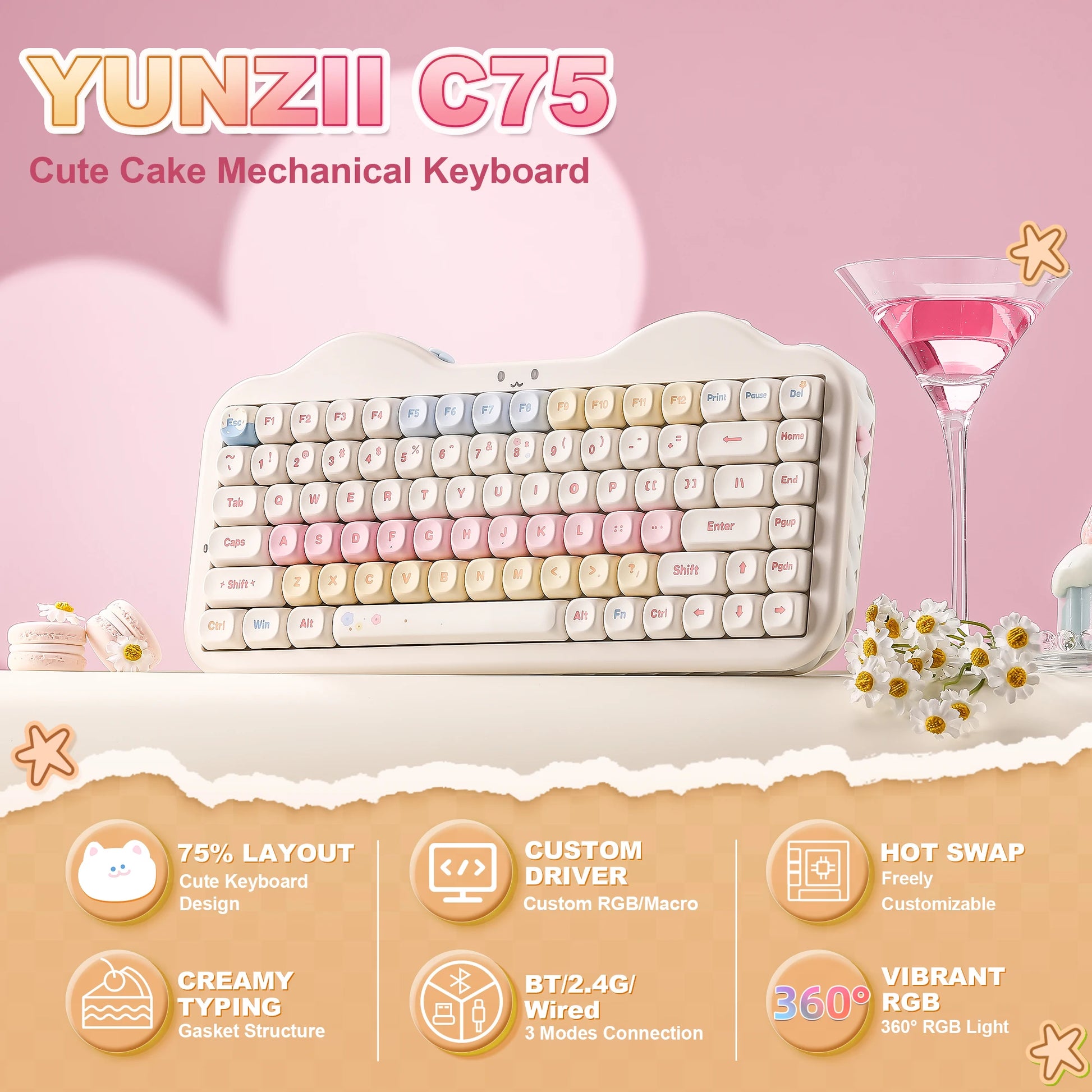 YUNZII C75 Wireless Mechanical Keyboard, 75% Creamy Hot Swap Custom RGB Keyboard, Gasket Cute Cake Design, for Win/Mac/Gaming