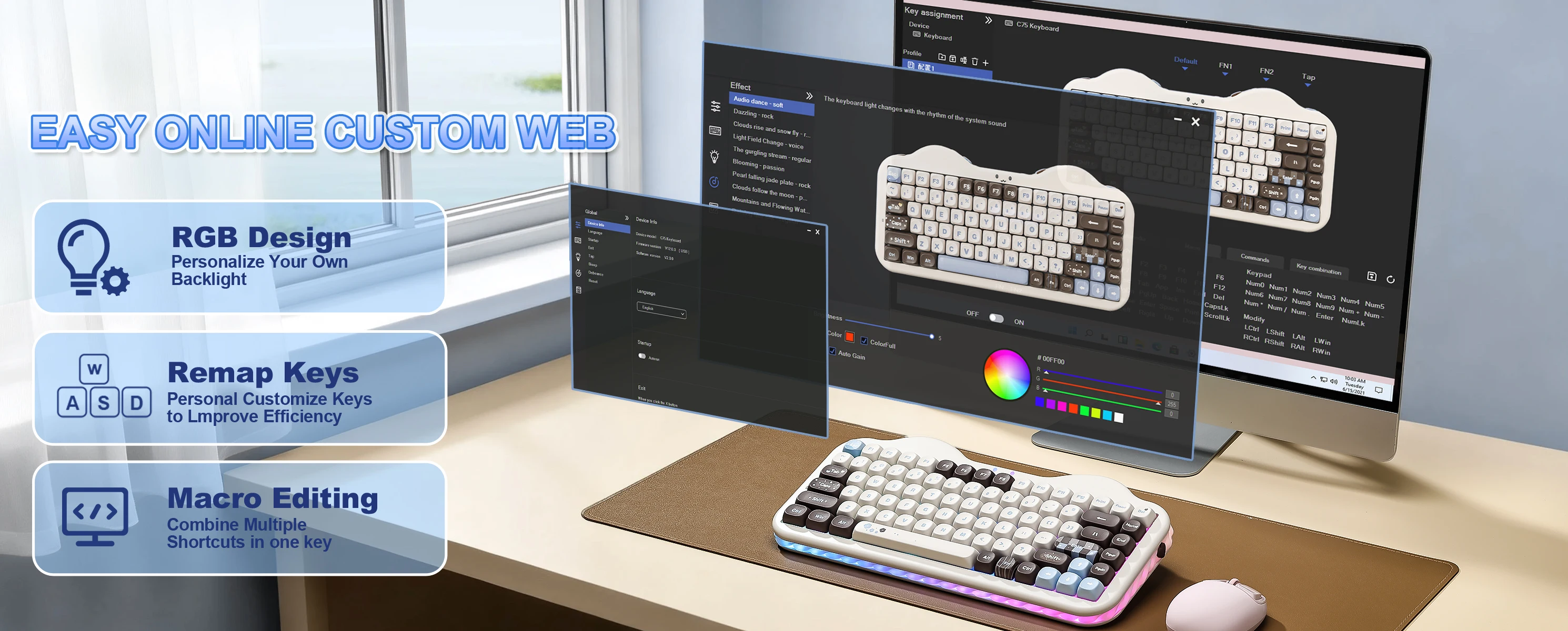 YUNZII C75 cute wireless keyboard offers limitless customization through programmable software, allowing you to remap keys, create complex macros, and personalize RGB backlit for both Windows and Mac systems. Powered by a high-capacity 5500mAh battery, the pc gaming keyboard delivers exceptional endurance, ensures stable performance during extended work sessions and gaming marathons.
